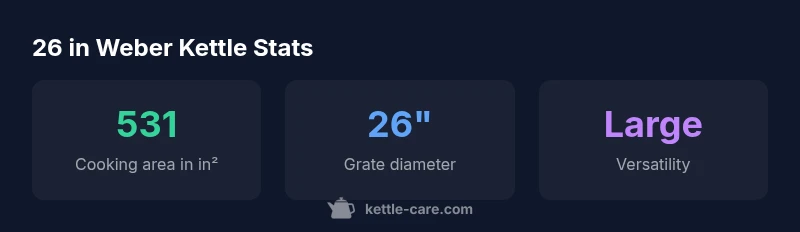 The 26 in Weber Kettle is Weber’s large, standard charcoal kettle, with a 26-inch diameter grate that provides about 531 square inches of cooking area. This size suits family gatherings and tailgates, enabling direct high-heat searing and controlled indirect cooking. According to Kettle Care analysis, 2026, it offers reliable heat retention and versatile airflow for long cooks.