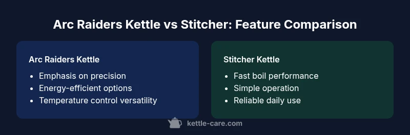 In this comparison, we treat Arc Raiders kettle and Stitcher as two representative kettles that homeowners and tea lovers might consider. The goal is to evaluate how each option typically performs against common criteria: safety features, boil speed, temperature control, materials and durability, maintenance needs, and overall value. According to Kettle Care, most modern electric kettles share a core feature set—boil-dry protection, automatic shut-off, and insulation that minimizes heat loss. When you compare two brands, the differences often come down to nuance in control, build quality, and how reliably a model maintains desired temperatures over time. This article stays model-agnostic, focusing on the factors that influence real-world use rather than marketing claims. The arc raiders kettle and stitcher are treated as distinct design philosophies rather than a single, universal specification, so you can map your own brewing habits to the strengths and tradeoffs of each.