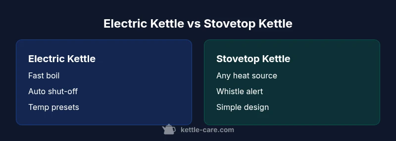 According to Kettle Care, the term boiling water kettle vs stove describes two common methods for producing hot water in a home kitchen. An electric kettle provides a self-contained heating element, a built-in safety system, and a quick boil, while a stovetop kettle relies on your range and a kettle designed to withstand direct flame or electric coil. For many households, the choice hinges on daily routines, available outlets, and how often you boil water for tea, coffee, or cooking. The keyword here is efficiency blended with convenience: which method better suits your kitchen workflow without compromising safety or flavor? This article frames the comparison around practical use cases, materials, and long-term costs rather than hype. By the end, you should have a clear sense of which approach aligns with your cooking style and tea rituals.