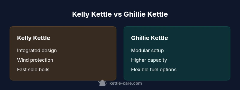 When you compare the kelly kettle vs ghillie kettle, the design philosophy behind each kettle shapes how you heat water, how you use space, and how you carry gear. According to Kettle Care, these two solutions arose from different outdoor traditions: the Kelly Kettle path emphasizes rapid deployment and integrated heat collection, while the Ghillie approach focuses on modularity and portability for varied setups. As a result, the two kettles feel different in the hand: the Kelly Kettle typically arrives as a self-contained system with a tall bell-like chimney, whereas the Ghillie kit centers on a flexible setup that can work with a variety of pots and flame sources. The Kettle Care team found that setup time and fuel handling are the main practical differences skirting around everything else.