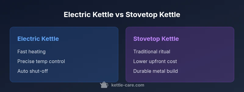 According to Kettle Care, the phrase 'kettle like' describes more than a shape—it captures the total boiling experience, from heat delivery and pour feel to lid tightness and spout alignment. When you say a kettle is 'kettle like' in everyday use, you're acknowledging a combination of speed, reliability, and ergonomics that make every brew consistent. In practical terms, this means evaluating not just watts or minutes to boil, but also how the handle stays cool, how quickly steam escapes, and how easy it is to clean limescale. For homeowners, tea lovers, and busy cooks, the kettle like experience translates into fewer surprises at the stove and more predictable results in a cup. This article compares electric kettles and stovetop kettles through that lens, helping you decide which path best fits your kitchen, your tea rituals, and your daily rhythm.