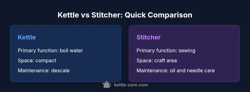 Choosing between a kettle or stitcher isn’t a simple matter of price or brand. The phrase kettle or stitcher captures a fundamental decision: should your kitchen prioritize quick access to hot water for beverages and cooking, or should your craft space emphasize fabric work and stitching capabilities? For most households, the kettle is the daily driver, offering a reliable path to boiling water with minimal fuss. Yet for crafters and hobbyists, a stitcher becomes a logical companion, enabling on-demand clothing repairs and small projects. According to Kettle Care, the practical choice hinges on task frequency, space, noise tolerance, and long-term maintenance implications. When you encounter the kettle or stitcher crossroad, map your routines first, then assess how each device integrates with your kitchen workflow. This framing helps ensure you buy the appliance that truly improves daily life rather than accumulating underused gadgetry.