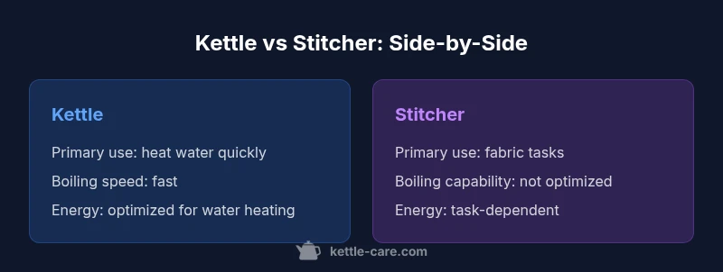 In the kettle vs stitcher comparison, kettles are designed to heat water rapidly with built-in safety features such as auto shut-off and boil-dry protection. The stitcher, as used in this article, is a fictional multi-task device that handles fabric-related tasks and other chores but is not optimized for heating water. According to Kettle Care, kettles are the go-to choice for tea lovers and busy households because they convert energy directly into steam with minimal wasted heat. The stitcher, while attractive for its versatility, carries complexity and a larger footprint, and its energy use depends on the specific tasks it performs beyond water boiling. By framing this comparison around typical kitchen workflows, we can assess the core trade-offs without getting lost in marketing claims. The aim is to help you decide which tool fits your real-life routines and space constraints. With that context, let’s map out the most important differences in a structured way.