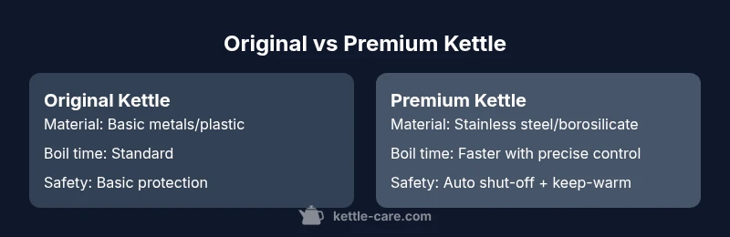 Original kettle vs premium might sound like marketing jargon, but it reflects real differences in materials, design, and intended use. In this guide we define an original kettle as a basic model that emphasizes simplicity, low upfront cost, and broad kitchen compatibility. A premium kettle refers to higher-end builds, often featuring metal or borosilicate glass walls, refined lids, precision spouts, temperature presets, and stronger safety certifications. For homeowners and tea enthusiasts, these distinctions translate into practical outcomes: faster boiling, more consistent pouring, and longer service life in daily routines. The decision between the two hinges on how you boil, how much you value speed, and how you weigh ongoing maintenance against initial price. The Kettle Care team has observed that premium kettles frequently deliver smoother performance under heavy use, while original kettles remain perfectly adequate for light, occasional use. By keeping expectations aligned with your kitchen habits, you can choose the option that best fits your needs and budget.