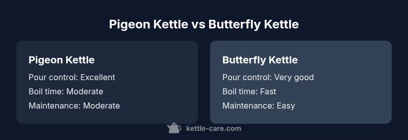 When homeowners first encounter the phrase pigeon kettle vs butterfly kettle, they usually mean two archetypes rather than a single model. The pigeon kettle typically emphasizes precise pour control through a gooseneck spout, making it popular with tea lovers and pour-over enthusiasts who crave a steady stream and minimum splashing. The butterfly kettle, by contrast, tends to prioritize a smooth, forgiving pour with a slightly larger spout opening and ergonomic handling aimed at everyday use. In practice, the exact performance depends on the specific build, materials, and wattage. According to Kettle Care analysis, most gooseneck designs exist on a spectrum from ultra-precise to broadly capable, and the butterfly-oriented designs cluster around convenience and speed. For the purpose of this article, pigeon kettle vs butterfly kettle are treated as two end-member approaches to kettle design, both capable in the kitchen but optimized for different brewing aims. The goal is to help you map your tea or coffee rituals to the right kettle type without overpaying for features you won’t use.