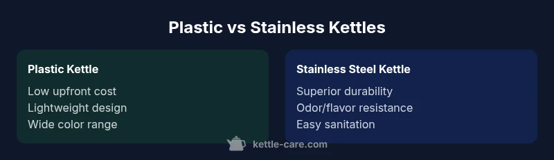 When you boil water, the kettle material directly influences heat transfer, flavor neutrality, and how you handle daily use. Plastic kettles are generally lighter and come in a wide range of colors and styles, which can be appealing for small kitchens or kids' spaces. Stainless steel kettles, by contrast, are typically heavier but offer robust durability and a nonporous surface that resists odors and staining. The real-world choice often hinges on interior construction as well: many modern plastic kettles use a plastic or composite interior with a protective coating, while stainless options may feature a stainless-steel interior or an aluminum core wrapped in steel. For readers of Kettle Care, the clear takeaway is this: the material sets the baseline for heat transfer, cleaning needs, and the potential for flavor migration into your water. The decision should start with how you interact with your kettle daily and how you value long-term performance over initial savings.