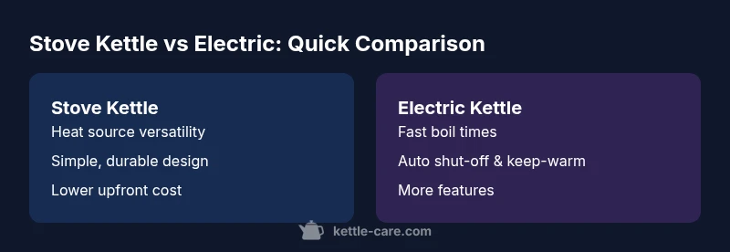 In the stove kettle vs electric decision, there are two core categories: stovetop kettles that heat water directly on a stove or induction surface, and electric kettles that rely on an integrated heating element and smart features. The stove kettle is often a simple, timeless tool built to endure decades of boiling cycles with minimal fuss. By contrast, an electric kettle tends to pack features—auto shut-off, keep-warm modes, temperature presets, and faster boil times—designed for modern kitchens and busy routines. The choice hinges on your heat source, how you drink tea or coffee, and how you balance convenience with durability. The Kettle Care team notes that many households value the ability to boil water quickly during weekday mornings while preserving tradition on weekends, which can tilt the decision toward one option or the other.