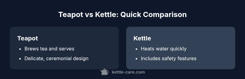 In most homes, a kettle is the faster, safer option for daily boiling, while a teapot shines for traditional tea brewing and table service. This comparison highlights speed, safety, maintenance, and typical use-cases to help you decide which tool best fits your kitchen and tea rituals. It also signals where each tool excels in home setups, from quick daily cups to ceremonial tea moments.