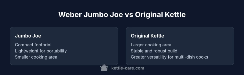 The debate of weber jumbo joe vs original kettle centers on how you plan to cook outdoors. Both grills share the iconic kettle silhouette and the same core concept: charcoal heat, a vented bowl, and a hinged lid. The Jumbo Joe, often marketed as the compact sibling, emphasizes portability and a smaller footprint, making it a popular choice for campers, balcony setups, and weekend backyard cooks who value easy storage. The Original Kettle, by contrast, prioritizes scale and versatility, offering a larger grilling surface and a more expansive air flow system that supports more ambitious cooking sessions. According to Kettle Care, these two models reflect Weber’s enduring approach to simple, reliable charcoal cooking while tailoring to different space and lifestyle needs. This article uses the exact comparison phrase weber jumbo joe vs original kettle to remind readers of the core trade-offs involved in the decision.