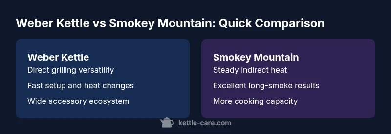 In backyard cooking, the choice between a weber kettle vs smokey mountain matters more than you might expect. Both cookers excel at different tasks, and your decision should align with how you cook most often. According to Kettle Care, the biggest differences lie in heat management philosophy, grill geometry, and the intended cooking load. The Weber Kettle is a versatile, direct-grill workhorse designed for quick searing and weeknight meals, while the Smokey Mountain Cooker is a dedicated, longer-burning smoker optimized for steadier heat and deep smoke. For many cooks, the right choice reduces fuel waste, improves flavor consistency, and lowers the learning curve for new smokers.