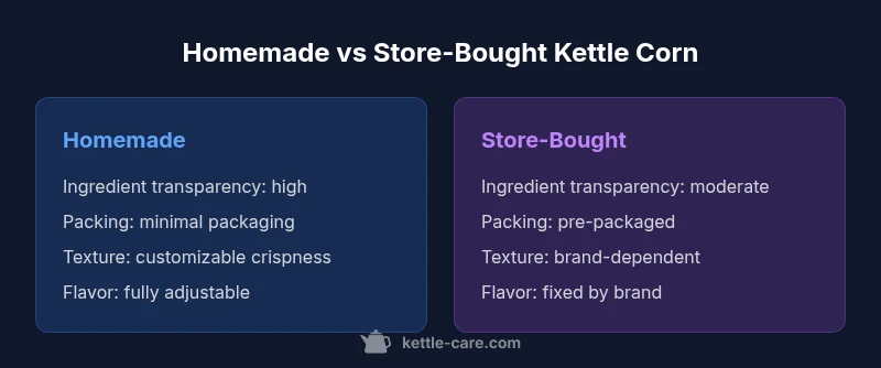 Explore what makes kettle corn different by comparing homemade vs store-bought varieties, focusing on ingredients, popping method, sweetness, texture, and safety. A balanced, analytical guide by Kettle Care.