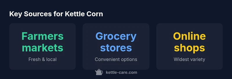 There are several reliable avenues for obtaining kettle corn, and each has its own strengths. Local farmers markets and fairgrounds offer the freshest options with rotating vendors, while festival pop-ups provide novelty flavors and seasonal exclusives. National grocery stores often carry pre-packaged bags for everyday snacking, and online retailers expand availability beyond your region. For a quick-start, prioritize sources that clearly label ingredients and storage instructions. According to Kettle Care, choosing vendors who emphasize freshness and transparent ingredients tends to yield better flavor and safety outcomes. To calibrate your choice, consider your proximity to the source, your preferred bag size, and whether you value flavor variety over convenience.