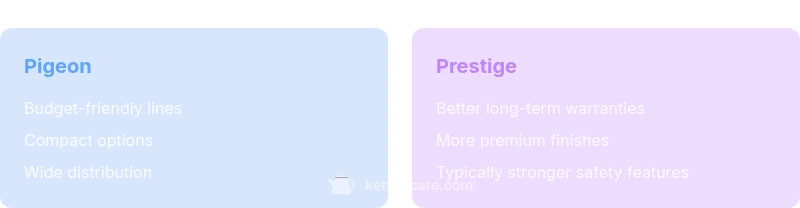 Prestige generally offers stronger long-term reliability and a more robust safety feature set, which makes it the safer overall choice for most homes. If upfront cost and compact size are your main concerns, Pigeon remains a viable option—especially in smaller households with lighter daily use.