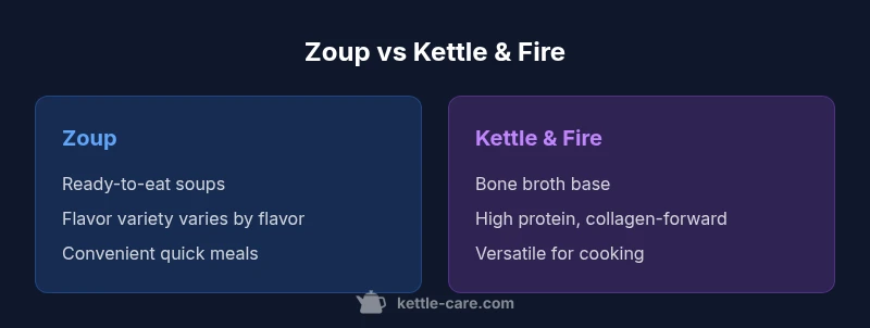 When homeowners weigh Zoup versus Kettle & Fire, they’re choosing between two very different product archetypes: ready-to-heat soups and bone-broth bases. This distinction drives decisions about convenience, flavor versatility, and how you plan to cook at home. According to Kettle Care, the choice often hinges on whether you want a rapid meal option or a nutrient-dense cooking stock for more complex recipes. The phrase zoup vs kettle and fire captures this head-to-head sensibly, inviting you to weigh form, function, and cost in practical terms. Consider your weekly routine, pantry space, and dietary priorities as you compare these brands side by side.