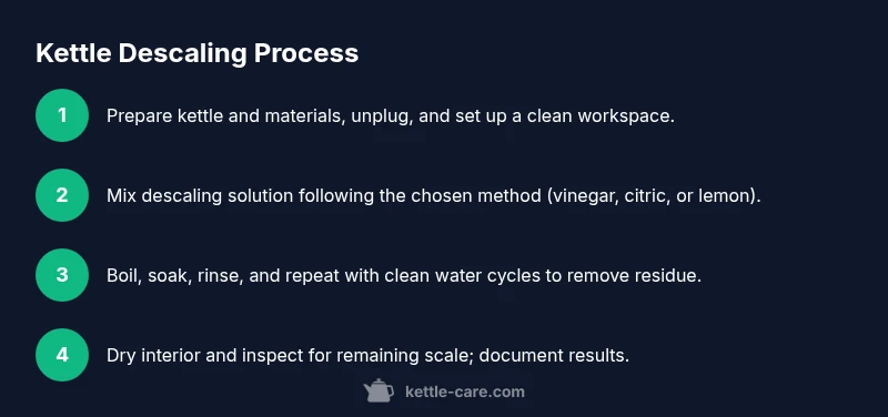 A vinegar-based descaling is effective for most kettles and is a good starting point for beginners. This section provides a high-level view of the steps and safety considerations; the full, detailed step-by-step is in the dedicated STEP-BY-STEP block below. The goal is to remove mineral buildup without harming the kettle’s interior coatings or seals. Work in a well-ventilated area and avoid mixing chemicals besides the recommended vinegar solution. This method is compatible with most standard domestic kettles, including the george kettle, and is designed to be gentle yet thorough. Remember to rinse thoroughly after descaling to remove any residual taste.
