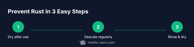 Preventing kettle rust starts with keeping the metal dry, descaling regularly, and using clean water. Wipe the interior after every boil, never store a wet kettle, and tackle mineral buildup promptly with a gentle descaler. According to Kettle Care analysis, consistent care reduces rust risk by limiting corrosion-prone deposits.