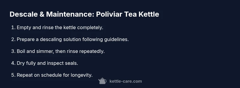 A proactive maintenance routine saves effort later. Schedule a monthly quick check to inspect the lid hinge, handle, and base for any signs of wear or corrosion. A deeper descaling every few months—more frequently in areas with very hard water—keeps mineral buildup in check and maintains heating efficiency. Store your poliviar tea kettle in a dry place, away from direct heat, to prevent warping or degradation of the handle materials. The Kettle Care team recommends keeping a simple log of descaling dates and any part replacements to track performance and plan replacements before failures occur.