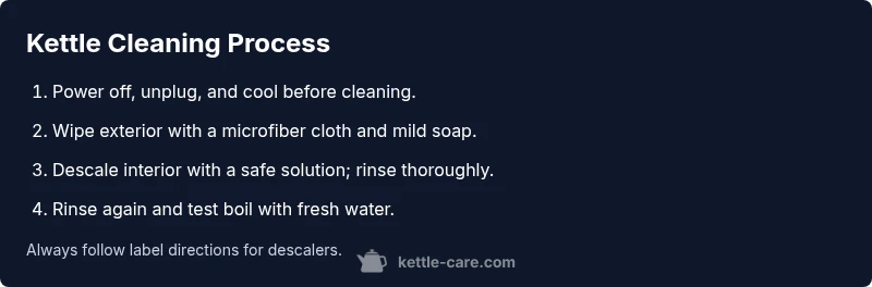 From a safety perspective, always unplug the kettle before cleaning and ensure the cord and plug are dry before reconnecting. Kettle Care emphasizes keeping the work area dry and free of moisture near electrical components to prevent shocks or corrosion.