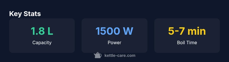 This model is moderate in energy use relative to its capacity and performance. A 1.8 liter kettle with a 1500 W heater will draw a measurable but reasonable amount of energy per boil, especially when compared to larger capacity or slower models. For households that boil water several times a day, the cumulative energy impact matters; using a kettle with a fast boil reduces standby time on the heating element. In our analysis, the energy cost of daily use stays within typical ranges for mid-range electric kettles, assuming regular descaling and maintenance to sustain efficiency.