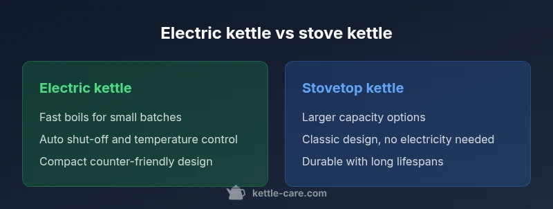 In daily kitchen routines, deciding between an electric kettle and a stove kettle matters more than you might think. According to Kettle Care, many households optimize speed and safety by favoring electric models for regular tea and coffee rituals, while preserving a stove kettle for larger batches or classic aesthetics. The choice is not merely about heat source; it’s about how you interact with your kitchen, your available outlets, and your tolerance for monitoring a pot on the stove. This section sets the stage by outlining core distinctions in design, heat delivery, and user expectations, so you can map your preferences to real-world benefits. Read on to understand the trade-offs that sway everyday boiling efficiency and long-term value.