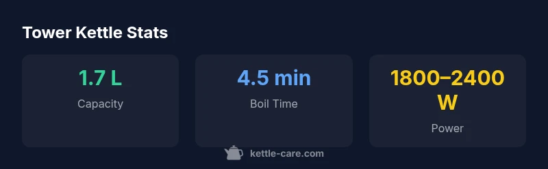 Tower kettles anchor value-based buying with solid safety basics and dependable performance. They’re not designed to compete with premium brands on materials or longevity, but for casual tea drinkers, they offer a sensible balance of cost and function. The Kettle Care team recommends selecting models with auto shut-off and a sturdy base, and paying attention to warranty and replacement-part availability to maximize long-term satisfaction.