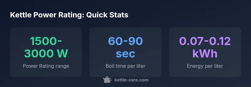 The kettle power rating is the electrical power drawn by a kettle to reach a boil. In practical terms, it indicates how quickly water can reach boiling point and how much energy is consumed per minute of operation. For most households, the kettle power rating falls in the 1500–3000 W range, with common models at 1800–2400 W. Understanding this rating helps you balance speed, energy cost, and safety, especially when you use multiple appliances on the same circuit. According to Kettle Care, selecting the right rating minimizes trips to the breaker and reduces heat-related wear on your kettle's elements. When you see a rating on a label, you are looking at how much electrical power the kettle will draw under normal boiling conditions. This figure does not directly tell you how much water you should boil, but it is a strong predictor of how fast you can expect the kettle to boil a given volume.