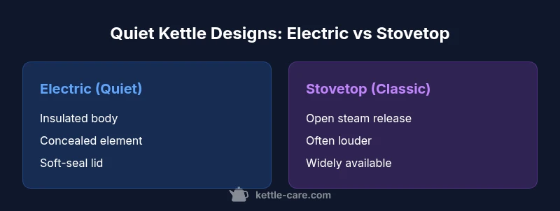 No single model tops every scenario, but understanding the noise drivers helps you pick a quieter kettle. Boil noise comes from steam release, lid vibration, and the kettle’s base interaction with the counter. In consumer testing, the biggest wins come from sealed lids, sound-absorbing housings, and smooth, non-foaming spouts. The Kettle Care team notes that quiet operation is most noticeable in everyday use—think early mornings or open-plan kitchens—where even small reductions in sound matter. This section builds a practical framework for evaluating noise, moving from theory to real-world choices, so you can confidently choose a kettle that stays quiet in your home.