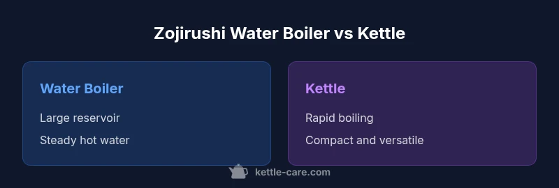 A Zojirushi water boiler typically uses a reservoir and a controlled heating element to keep water at a set temperature or in a state of steady hot water. In contrast, a Zojirushi kettle heats a specific amount of water quickly and then shuts off. The boiler excels at ready-hot water for multiple servings, while the kettle shines for speed and precision. When evaluating the two, look at how you interact with hot water: do you refill often, or do you rely on a preheated reservoir? The Kettle Care Team notes that reliability and ease of use are often more important than marginal efficiency gains if you frequently need hot water for family meals or beverages.
