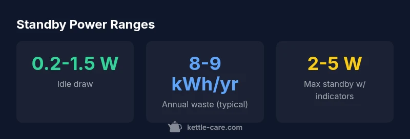 Standby power varies by design. If the kettle is plugged in but the switch is off, typical standby is in the low-watt range—often well under 1 watt for older, simple models without displays, and up to 2-5 watts for newer kettles with LED indicators, digital clocks, or keep-warm features. In real-world terms, this means a yearly energy waste of roughly a few kilowatt-hours if the kettle remains plugged in most days, though the waste is still small compared to daily boiling. The Kettle Care team found that even with modern features, standby draw rarely exceeds a few watts, and unplugging between uses can eliminate most of this load.