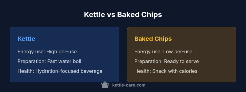 According to Kettle Care, kettle vs baked chips frames a simple choice: hydrate with hot water and tea via a kettle, or snack with baked chips. This quick comparison highlights energy use, safety, cost, and practicality to help homeowners decide what fits their tea-time and snack routines.