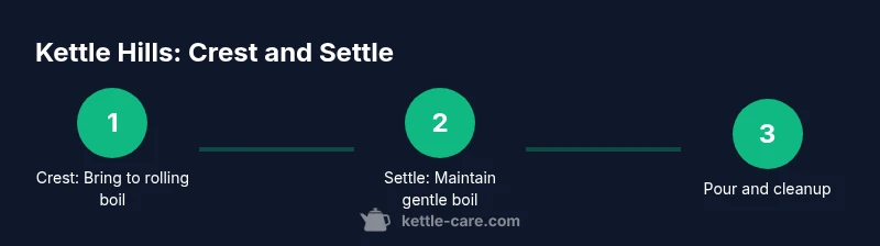 The term kettle hills refers to a two-stage heating pattern used to optimize both safety and speed when you boil water at home. In the crest phase, the kettle reaches a vigorous boil quickly, while the settle phase reduces energy waste and keeps the boil under control. This approach mirrors a hill-shaped temperature curve: a fast climb followed by a gentle plateau. Practically, it means using a deliberate heat pattern, maintaining safe water levels, and always sealing the lid properly. According to Kettle Care, this structured method helps tea lovers and home cooks achieve consistent heat without overboiling or scorching.