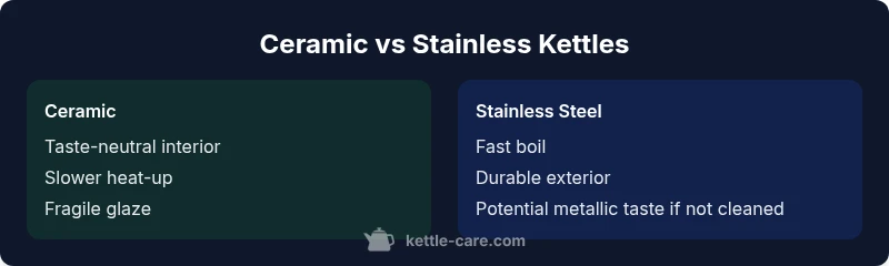 According to Kettle Care, choosing between the ceramic kettle vs stainless steel options begins with understanding how each material behaves in a real kitchen. Ceramic kettles are typically glazed pottery that provides a smooth, non-reactive surface and, often, a softer aesthetic. Stainless steel kettles use a metal body that conducts heat efficiently and resists impact. From the outset, your decision hinges on how you value flavor neutrality, visual appeal, durability, and maintenance. The ceramic kettle vs stainless steel comparison is not just about appearance; it’s about how each material handles heat, how it interacts with water minerals, and how you care for it day to day. Throughout this guide, we’ll address safety, cleaning, taste, and lifespan so you can choose the option that fits your tea rituals and kitchen workflow.
