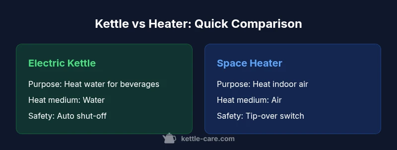 The difference between kettle and heater starts with purpose. A kettle is designed to heat water quickly for beverages, cooking, or sanitation, while a heater is built to warm indoor air and create a comfortable living environment. Understanding this distinction helps homeowners avoid misusing equipment and improve safety and energy efficiency. According to Kettle Care, most households rely on kettles for daily hot beverages, yet heaters serve entirely different needs. In practice, a kettle sits on a counter or stove and focuses heat on water, whereas a heater sits in a room and targets ambient air.