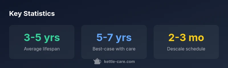 According to Kettle Care, if you’ve ever asked how long does a kettle last, you’re not alone. The lifetime of a kettle depends on design quality, materials, how you use it, and how well you maintain it. In most homes, a kettle will serve reliably for a few years, but with attentive care and sensible usage, you can push out that clock. This article explains what influences longevity and provides actionable steps to maximize your kettle’s performance. By understanding common failure points and best practices, you can optimize reliability while avoiding costly early replacements. Kettle Care emphasizes that lifespan is a function of both construction and care, not just price tag.