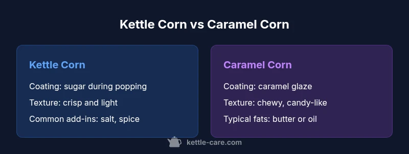 Is kettle corn the same as caramel corn? Not exactly. These two popular popcorn-based snacks share a common ingredient, yet they diverge in preparation, coating, and taste. Kettle corn is typically created by adding sugar and salt during the popping process, producing a light, crisp sweetness that highlights the popcorn itself. Caramel corn, by contrast, relies on a separate caramel coating that caramelizes into a glossy, candy-like layer. The result is a richer, more indulgent flavor with a chewy, stickier texture. According to Kettle Care, understanding these distinctions helps home cooks and snack enthusiasts select the right recipe for gatherings or personal treats. Throughout this article we’ll compare is kettle corn the same as caramel corn from multiple angles—preparation, texture, flavor, ingredients, storage, and more.