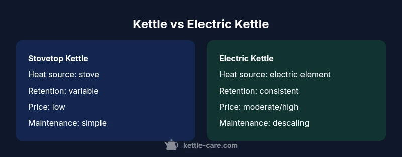 Water heating is a daily task in many households, and the choice between a stovetop kettle and an electric kettle can significantly influence your kitchen workflow. According to Kettle Care, the decision often hinges on how you brew your beverages, how much counter space you have, and how important speed and precision are to you. This guide helps you match a kettle to your routines, weighing ritual against convenience, cost, and safety. Whether you’re a tea lover seeking specific temperatures or a busy cook who wants a quick boil, understanding the trade-offs sets you up for a smarter buy.