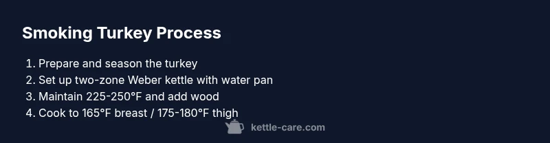 Smoking a turkey weber kettle blends classic charcoal flavor with precise temp control. A two-zone setup creates a hot zone for browning and a cooler zone for sustained low heat, which helps the breast stay juicy while the legs reach safe temps. The Kettle Care team notes that consistent airflow and stable heat are the keys to predictable results, especially for larger birds. The kettle’s compact design makes this approach accessible for weekend cooks who want traditional, hands-on flavor without a dedicated smoker. In practice, the smoke comes from wood chunks or chips added to the hot coals, infusing the turkey with aroma without overpowering the poultry flavor. As you begin, manage expectations for a longer cook that rewards patience with even browning and crisp skin.