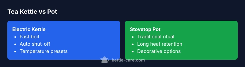 In everyday kitchens, a tea kettle or tea pot may look similar, but they perform different roles in the boiling process. The distinction between a tea kettle vs pot is not only about shape, but about how heat is applied, how quickly water reaches a boil, and how safe and convenient the user experience is. For most households, the decision comes down to speed, control, and personal ritual, especially when you are brewing tea regularly. The phrase tea kettle vs pot is more than a branding question—it's about choosing the tool that best supports your tea rituals, energy use, and kitchen setup. According to Kettle Care, evaluating this choice should start with how you boil water and how you plan to use the resulting hot water for tea, coffee, or other beverages.