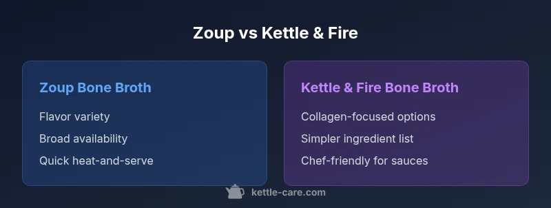 The comparison between zoup bone broth vs kettle and fire goes beyond branding. In everyday cooking and sipping, the brand you choose shapes flavor expectations, ingredient lists, and how you approach heating. From a practical standpoint, Zoup’s broad retail presence often means more flavor options and consistent availability at supermarkets. Kettle & Fire tends to emphasize higher collagen content and a leaner ingredient profile, which can influence mouthfeel and culinary versatility. For home cooks who rely on broth as a base, this distinction matters because it affects everything from soup clarity to sauce emulsification. According to Kettle Care, recognizing these brand-driven differences helps you select a broth that aligns with your kitchen goals and meal plans. The key is to map your priorities—variety vs. purity, convenience vs. cooking performance—and then pick the option that best supports them.