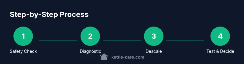 - Unplug the kettle and ensure it is completely dry. 2) Visually inspect for cracks, leaks, or damaged seals. 3) Descale if mineral buildup is visible or performance is poor. 4) Test the power switch and cord for visible wear. 5) If accessible, test the heating element with appropriate tools. 6) Reassemble and test with water, listening for normal boiling sounds. 7) Decide between repair and replacement based on cost and warranty.