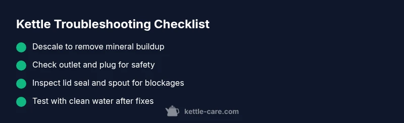Most kettle problems stem from mineral buildup, a faulty switch, or overheating. Start by descaling and cleaning the interior, then check the power outlet and cord for damage. Inspect the lid, seal, and filters for blockages. If it still won’t boil, proceed with the full diagnostic flow and step-by-step fixes to identify the exact cause.