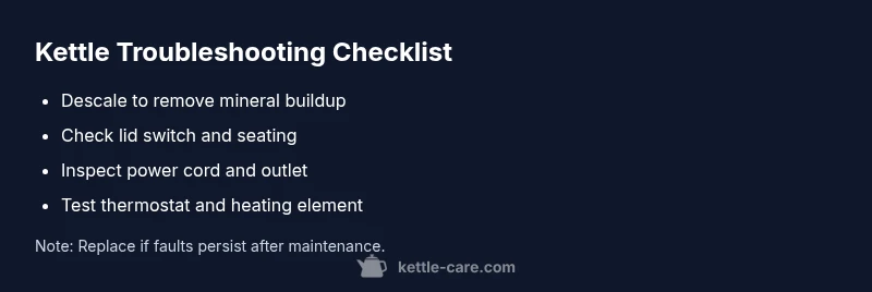 When a kettle stops before reaching a full boil, it isn’t just annoying—it can signal a safety-related fault or a common maintenance issue. In many homes, mineral scale from tap water builds up on the heating element and thermostat, triggering a reduced heating response or a premature shutoff. A worn thermostat or damaged safety switch can also cause the kettle to halt mid-cycle. In some cases, electrical problems, such as a loose cord or a voltage fluctuation, can mimic mechanical faults. Recognizing the pattern—does it stop on every cycle, or only after a long period of use?—helps narrow the list of suspects. According to Kettle Care analysis, scale and aging components are the two most frequent culprits for kettles that stall before boiling, especially in hard-water regions. As a homeowner, you can take decisive steps to diagnose and often fix the issue without specialized tools.