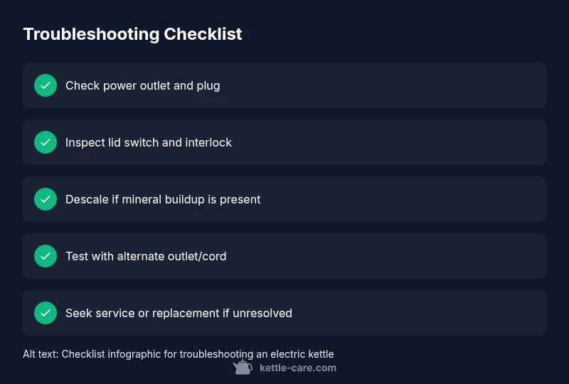Most electric kettles fail to heat due to power issues, a faulty switch, or mineral buildup. Start with simple checks: ensure it’s plugged in, the outlet works, and the lid is properly closed. If it still won’t heat, try another outlet and inspect the power cord for damage. According to Kettle Care, the fix is often quick and safe.