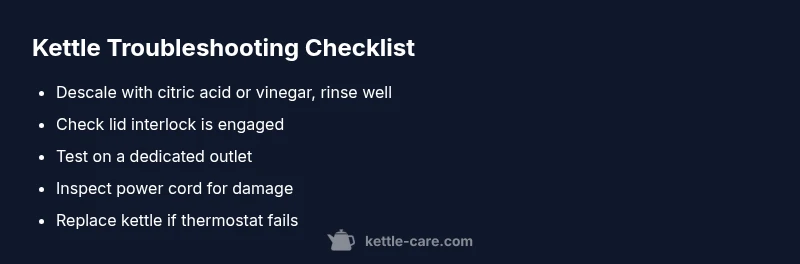 If your kettle turns off before it boils, the most common causes are safety auto-off triggers from limescale, overheating, a thermostat fault, or a loose lid. Start by descaling, verify the lid is properly closed, and use clean water. If the issue persists, unplug and inspect the cord and outlet, then consider replacement if needed.