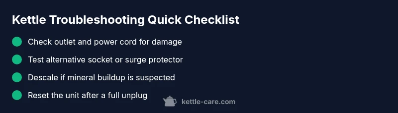 Start with power: outlet, cord, and plug. Ensure the kettle is plugged in securely and try a known-good outlet. If the outlet is fine, perform a reset by unplugging for 60 seconds. If there’s still no response, inspect for visible damage or burn smells.