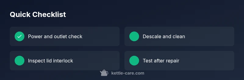 At first glance, the phrase why is kettle not playing tonight might feel dramatic, but the root issue is usually simple. Most kettles fail to heat because of power, safety, or mineral buildup. In practical terms, 'not playing tonight' means the kettle refuses to turn on or fails to reach a boil. This guide from Kettle Care focuses on urgent, practical steps to diagnose and fix the problem quickly, with safety as the top priority. You’ll learn to identify symptoms, run quick checks, and determine whether you can safely repair at home or need professional help. By following these steps, you can restore hot water access tonight and reduce the risk of further damage.